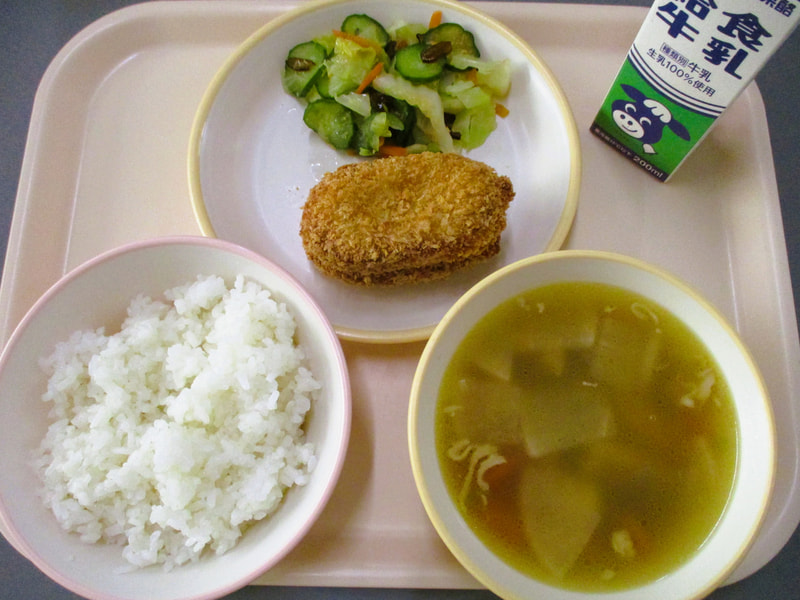 本日のメニューは、ごはん、けんちん汁、あじカツ、茎わかめ和えでした。
