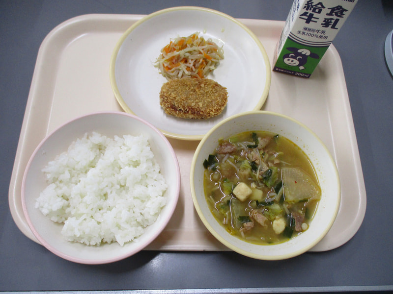 本日のメニューは、ごはん、キムチチゲ、餃子メンチカツ、もやしの塩炒めでした。