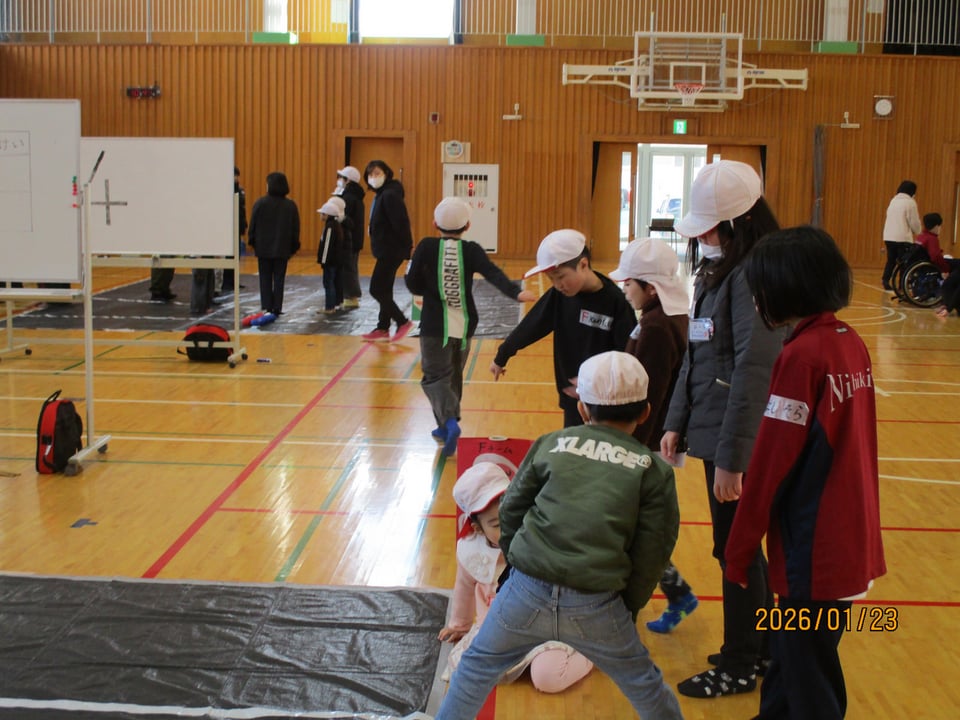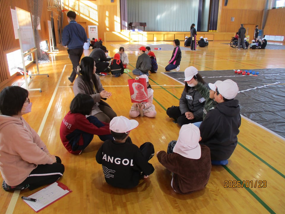 常盤小学校、西岐波小学校、西岐波中学校の三校合同でボッチャ大会を行いました。中学生が作戦をたて、成功すると歓喜の声に包まれる場面がありました。児童に声をかけたり誘導したりと、各チームのリーダーとして活動していました。