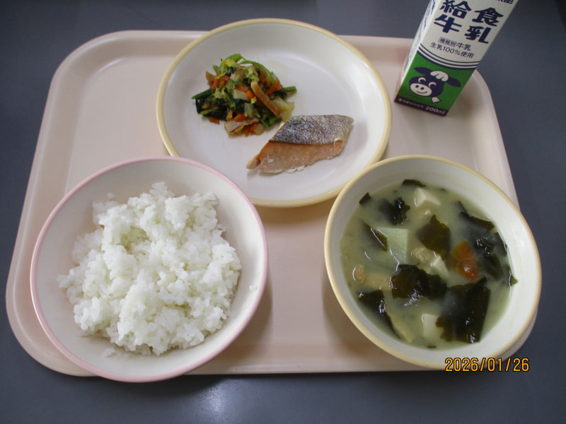 本日のメニューはごはん、みそ汁、鮭の塩焼き、煮びたしでした。