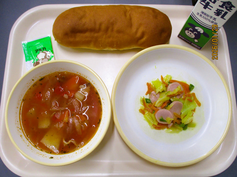 本日のメニューは、パン、マーガリン、トマトシチュー、魚肉ソーセージと野菜のソテーでした。