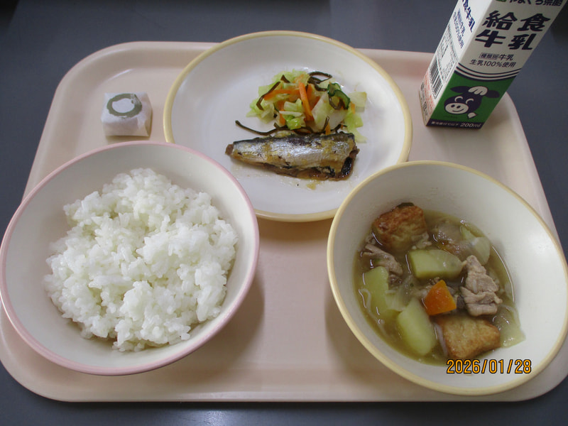 本日のメニューは、ごはん、塩肉じゃが、いわしのみぞれ煮、キャベツと昆布のさっぱり和え、利休さん(まんじゅう)でした。