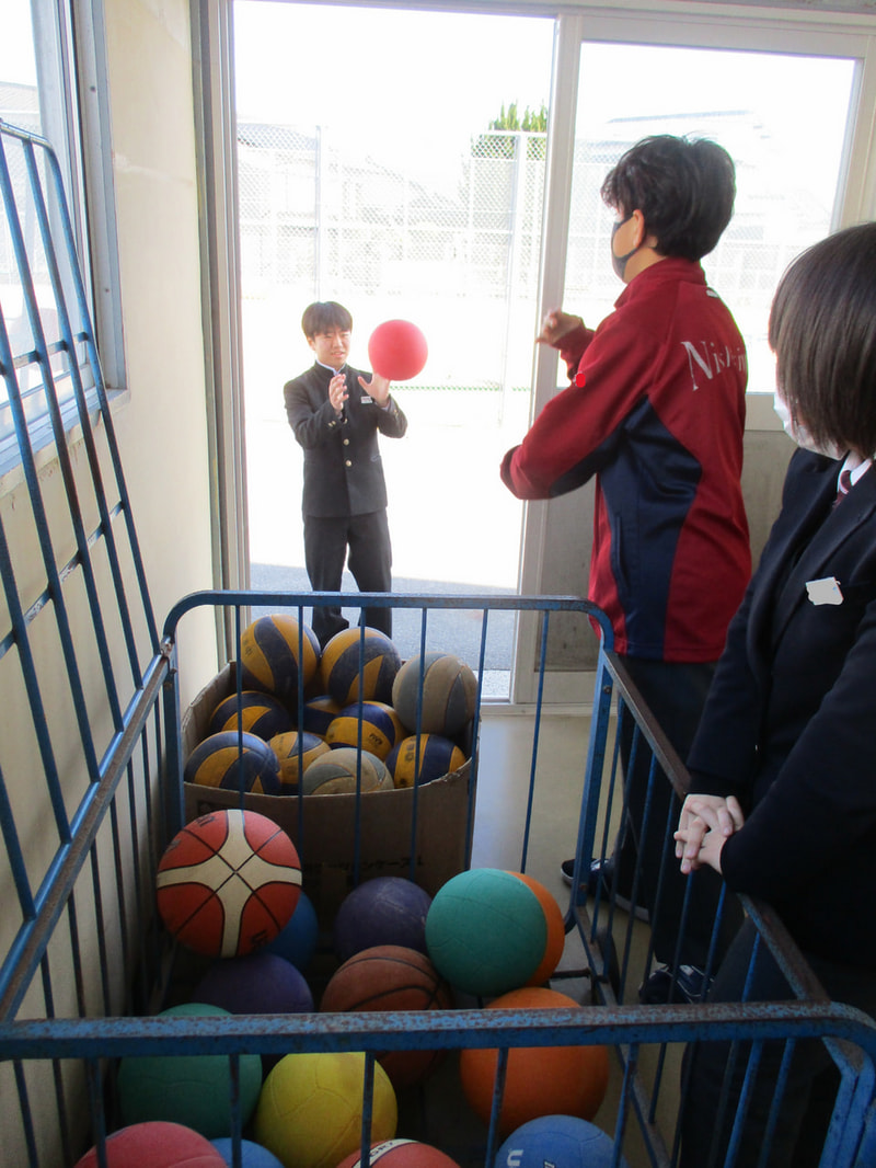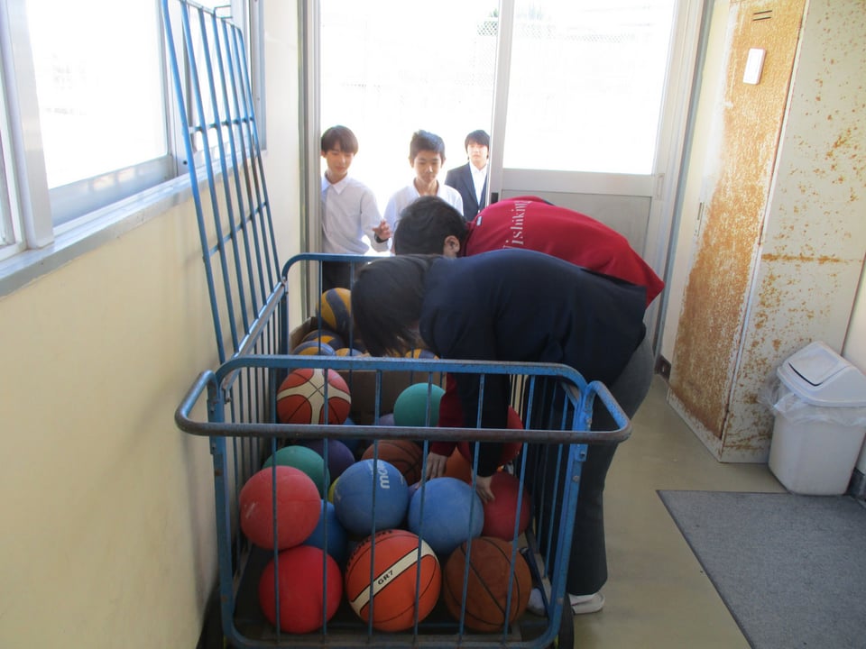 以前はボール使用希望者が多く、ボールの取り合いが発生していたのですが、保体委員会の働きによりボールの数が増えました。より多くの生徒が、外で元気に遊び、体力づくりに励んでほしいと思います。