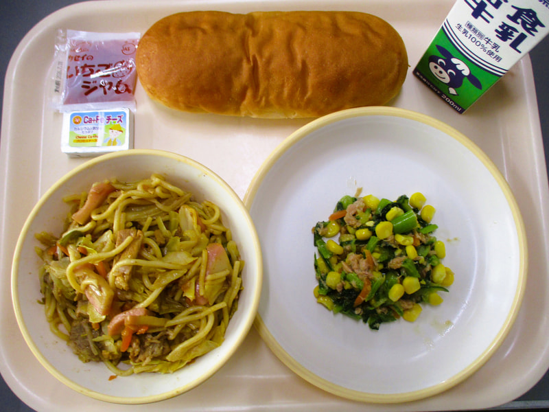 本日のメニューは、小パン、いちごジャム、焼きそば風スパゲティ、こまつなサラダ、ベビーチーズでした。