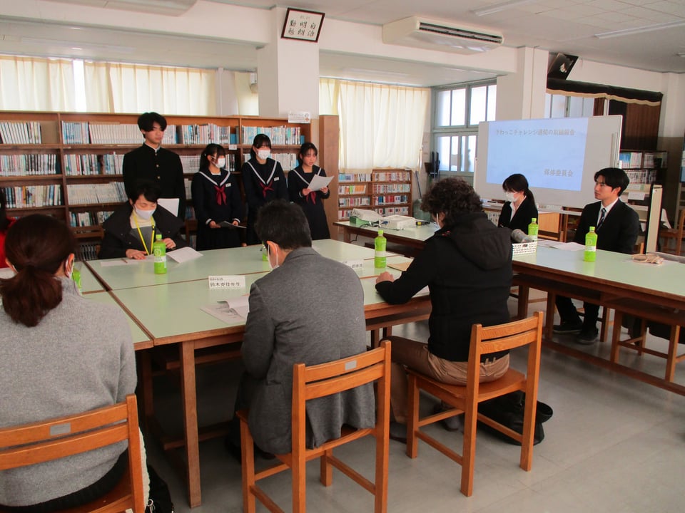 会の最初に、保体委員会の生徒による「きわっこチャレンジ週間」の取組報告や、健康診断・スポーツテスト結果、学校安全の取組等についての情報を共有しました。