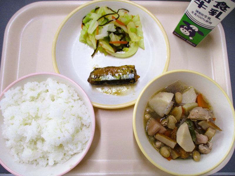 本日のメニューは、ごはん、大豆と野菜の煮物、さんまの甘露煮、塩こんぶ和えでした。