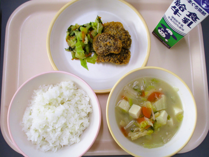 本日のメニューは、ごはん、白菜のみそ汁、鯨カツ、大根葉のごま炒めでした。