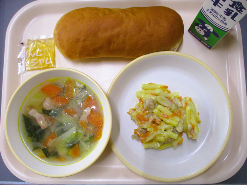 本日のメニューは、パン、りんごジャム、じゃがいもとベーコンのスープ、マカロニのクリーム煮でした。
