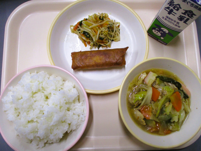 本日のメニューは、ごはん、八宝菜、春巻き、もやしのポン酢炒めでした。