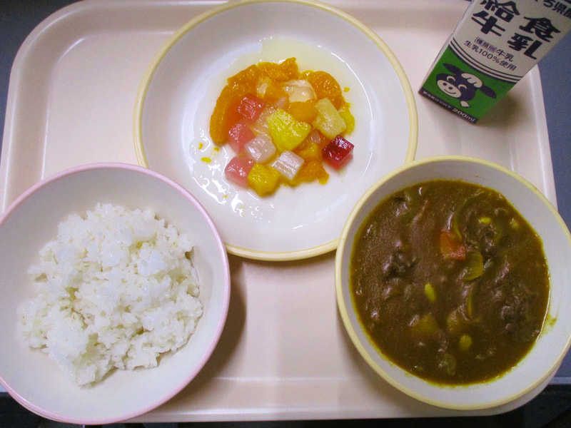 本日のメニューは、麦ごはん、カレーライス、フルーツミックスでした。