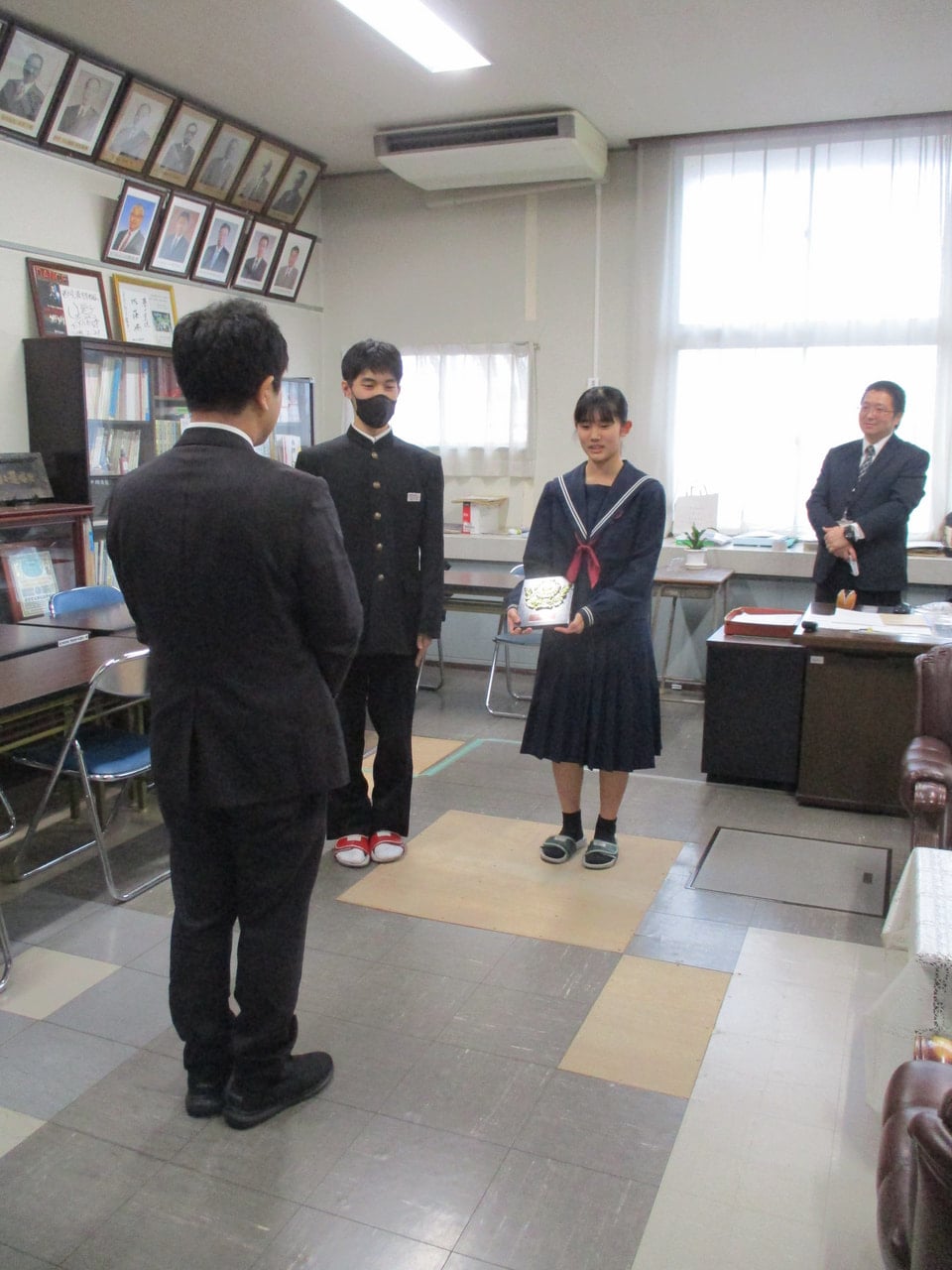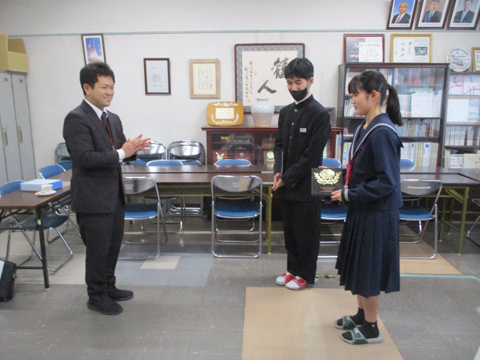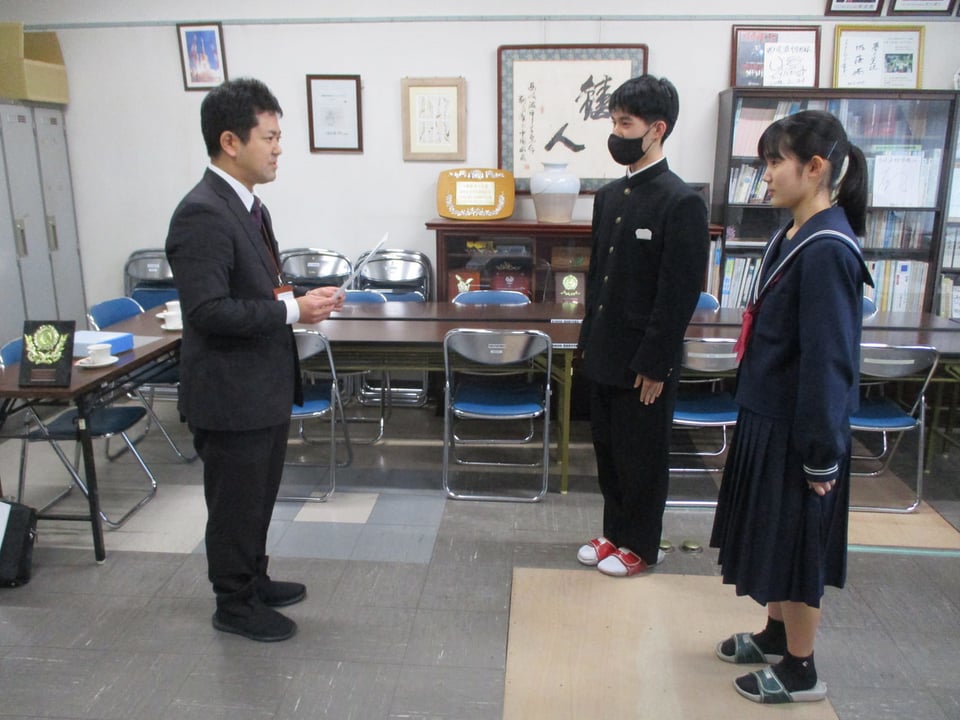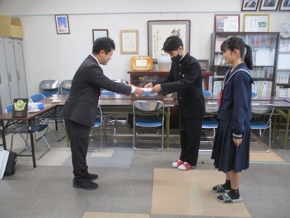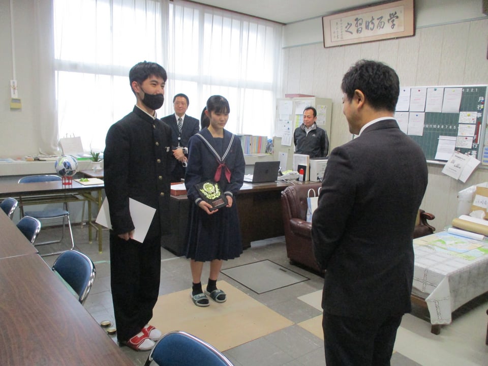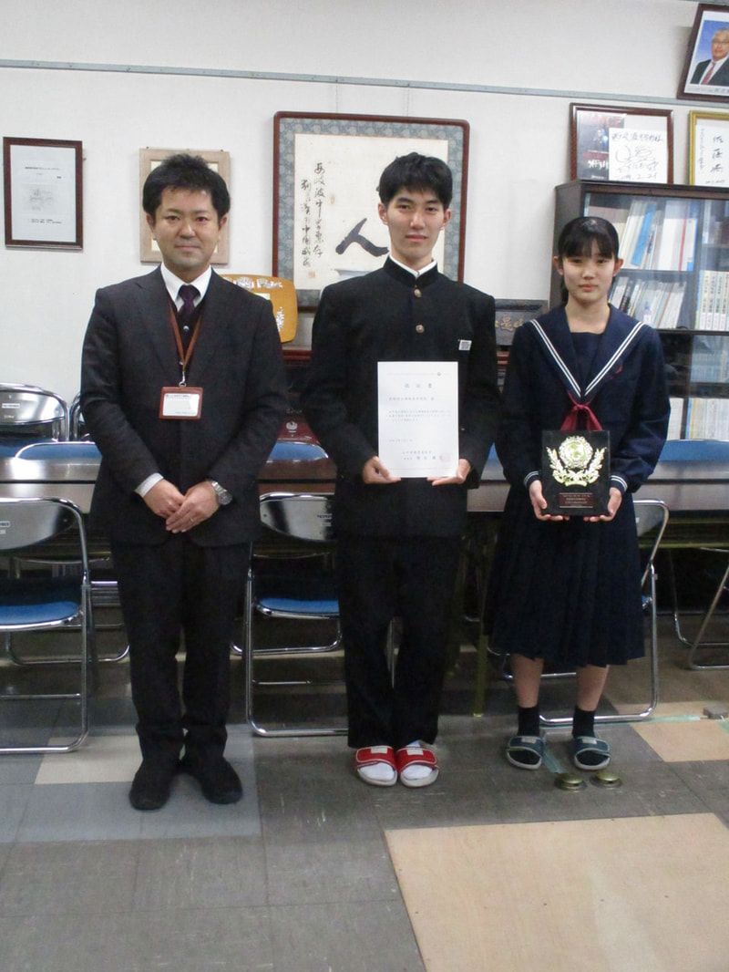 本日放課後、県教育委員会の方々がお越しくださり、本校で20年間続いたエコリーダースクールの実績を称え、前整美委員長と現整美委員長の2名が生徒代表として表彰を受けました。