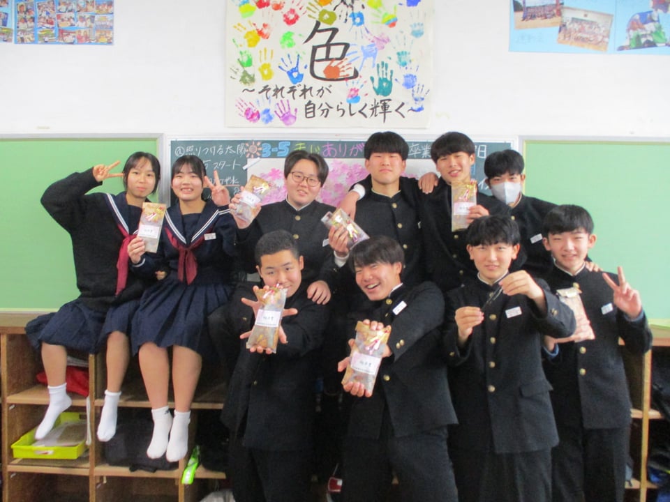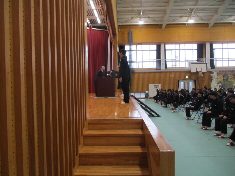 記念品贈呈式は今回初めての取組で、社会福祉協議会長様と副会長様にお越しいただき、記念品となるシャープペンシルをいただきました。卒業後もふるさとに貢献できるよう、しっかりと勉学に励みたいと思います。