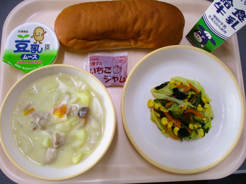 本日のメニューは、パン、いちごジャム、クリームシチュー、海藻サラダ、豆乳ムースでした。