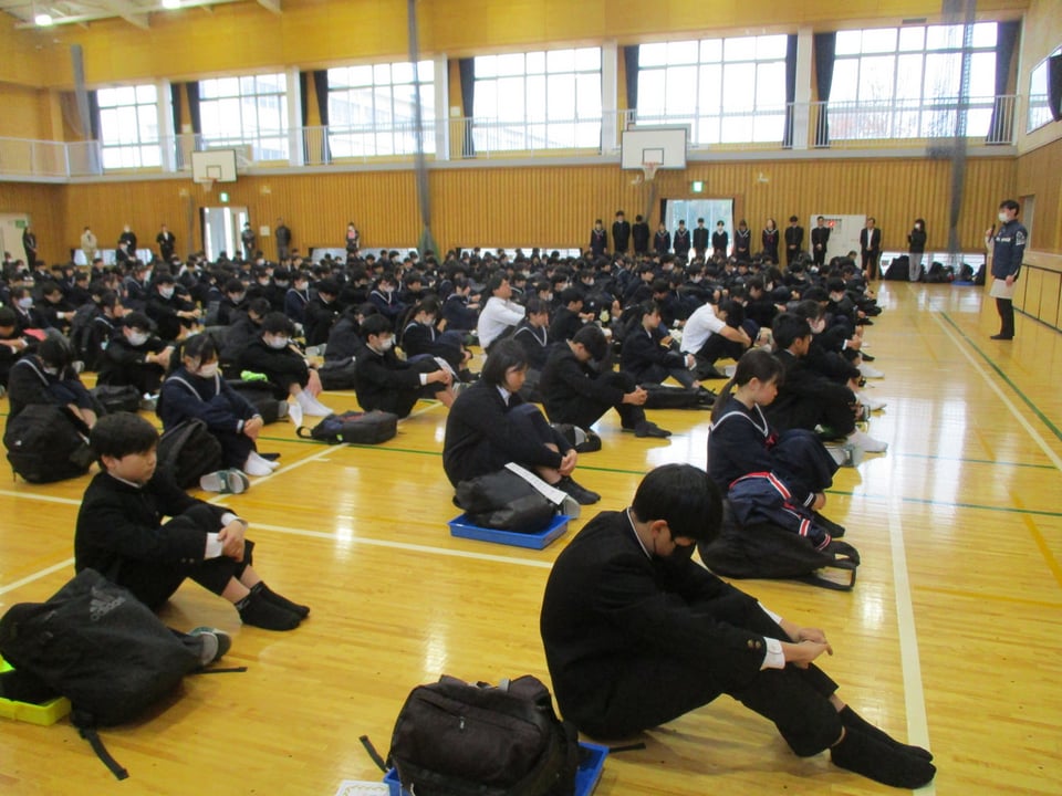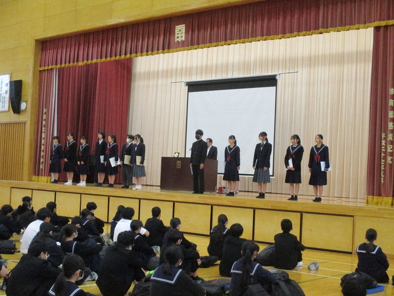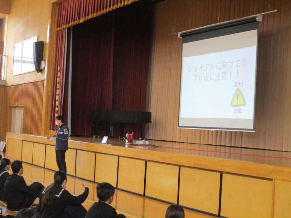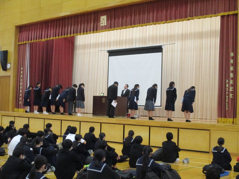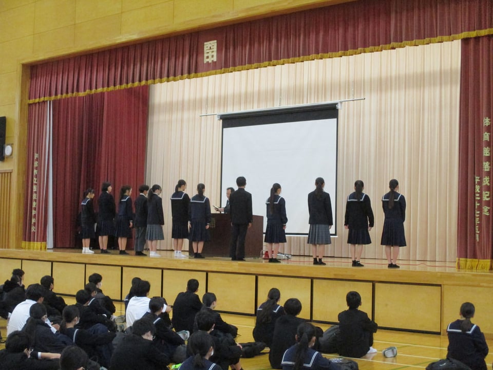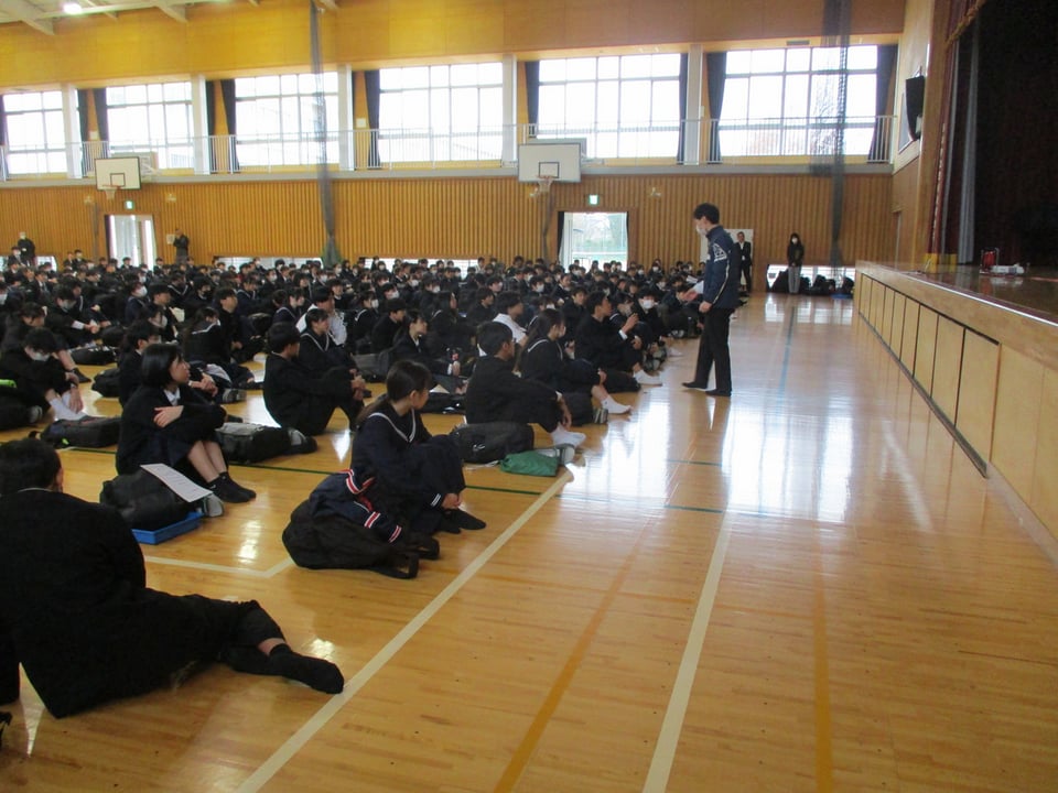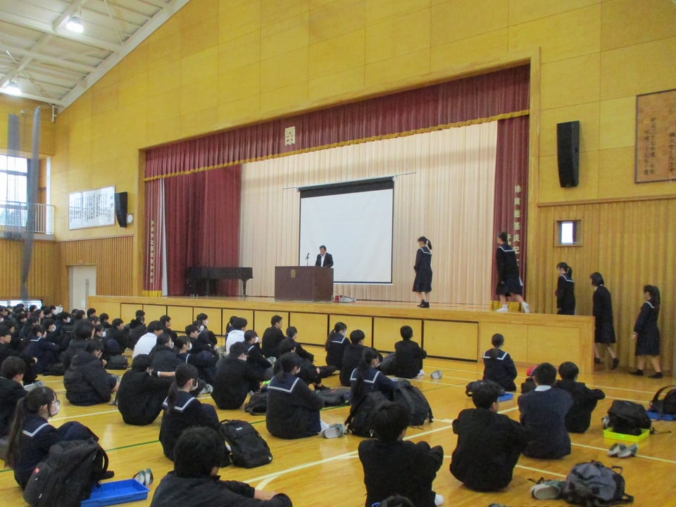 また、生徒指導主任から今年度の振り返りと来年度に向けた心がけについて話がありました。特に、生活面や交通面についての注意があり、4月から始まる自転車の交通違反に対する「青切符」について、再度確認をしました。