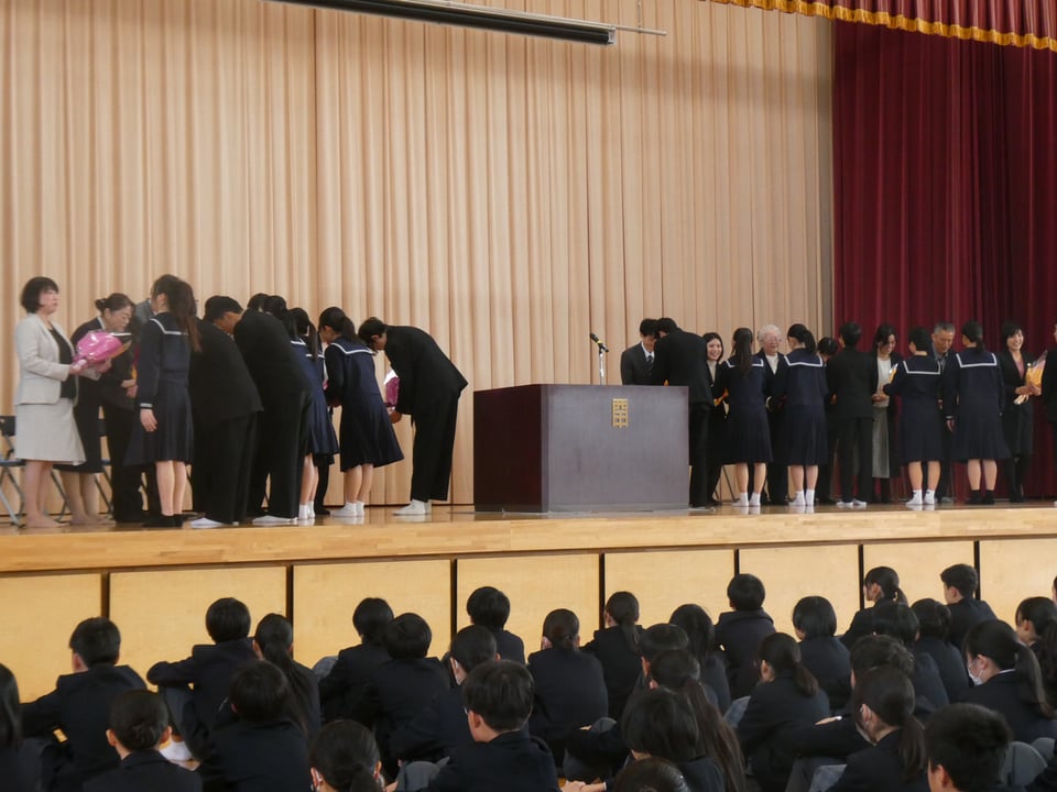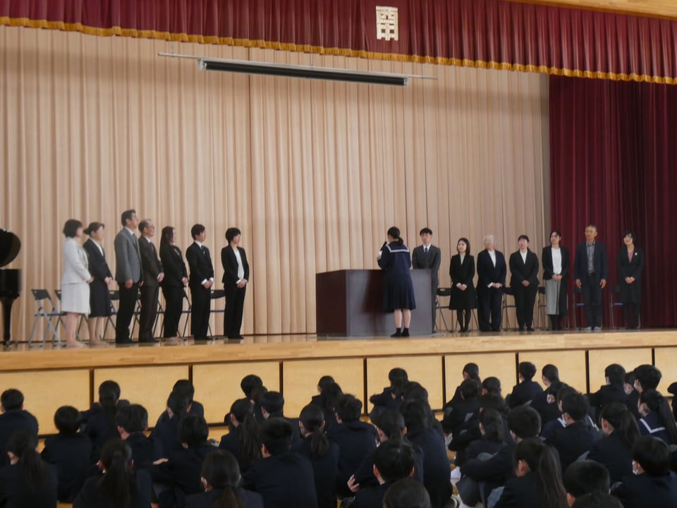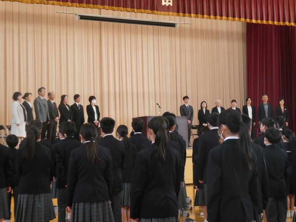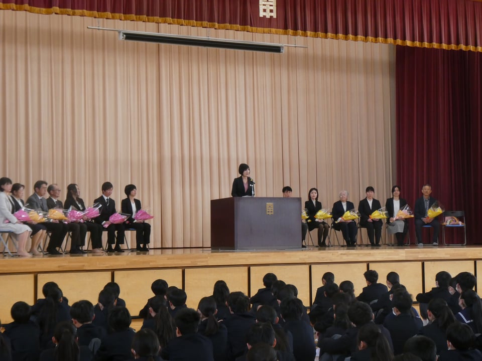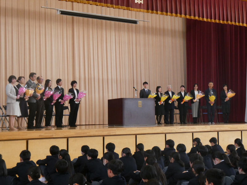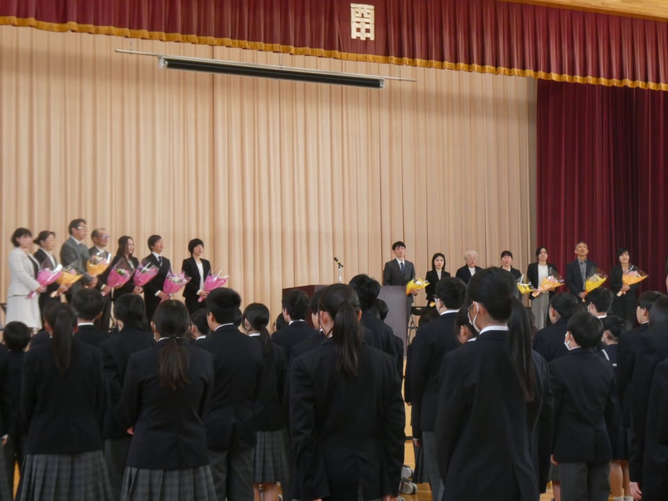 本日、本校体育館で離任式が行われました。このたびは15名の教職員が西岐波中学校を去ることとなりました。
