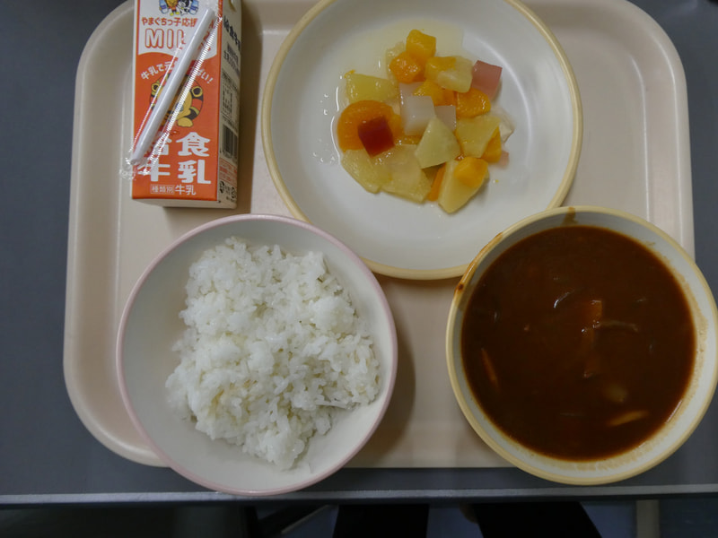本日の給食は、ごはん、ハヤシライス、フルーツミックス、牛乳でした。給食については、曜日でごはんの日とパンの日が決まっており、月火水金がごはんの日、木がパンの日となっています。今日もおいしくいただきました。ごちそうさまでした。