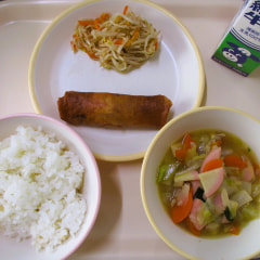 本日のメニューは、ごはん、八宝菜、春巻き、もやしの甘酢炒めでした。