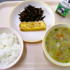 本日のメニューは、ごはん、さつま汁、ひじきごはんの具、五目厚焼きたまごでした。