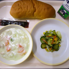 本日のメニューは、パン、パテチョコレート、クリームシチュー、ぷちぷちサラダでした。