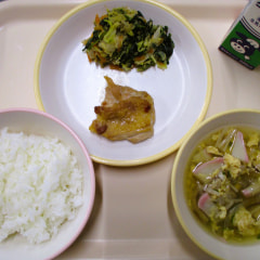 本日のメニューは、ごはん、かきたま汁、鶏肉の照り焼き、野菜のごま和えでした。