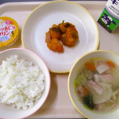 本日のメニューは、ごはん、みそけんちん汁、豚肉と野菜の炒め物、ころりん黒糖豆でした。