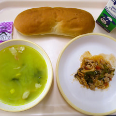 本日のメニューは、パン、レーズンクリーム、コーンスープ、ポークケチャップでした。