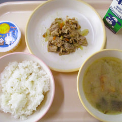 本日のメニューは、ごはん、いものこ汁、豚肉のしょうが炒め、十五夜ゼリーでした。