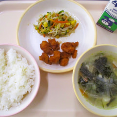 本日のメニューは、ごはん、わかめスープ、ヤンニョムチキン、チョレギサラダでした。
