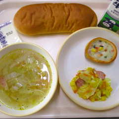 本日のメニューは、パン、ソフトチーズ、白菜スープ、ポテトカップグラタン、野菜ソテーでした。