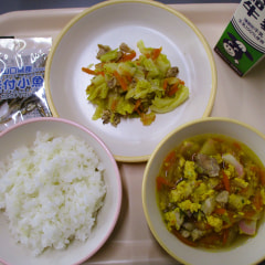 本日のメニューは、パン、県産ぽんかんジャム、ジュリエンヌスープ、鶏肉のフリカッセでした。