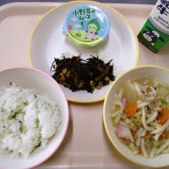 本日のメニューは、小菜飯、ちゃんこうどん、大豆の磯煮、小野茶ムースでした。