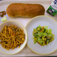本日の給食は、小パン、メープル&マーガリン、ミートソーススパゲティ、コーンサラダでした。