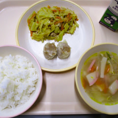 本日の給食は、ごはん、ワンタンスープ、しゅうまい、キャベツのごま酢炒めでした。