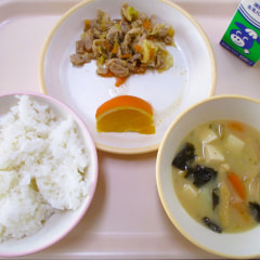 本日のメニューは、ごはん、みそ汁、豚肉のしょうが炒め、オレンジでした。