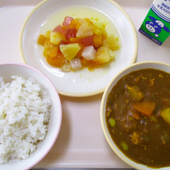本日のメニューは、麦ごはん、夏野菜カレー、フルーツミックスでした。