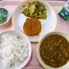 本日のメニューは、麦ごはん、うベジタブルカレー、チキンカツ、野菜サラダ、小野茶プリンでした。
