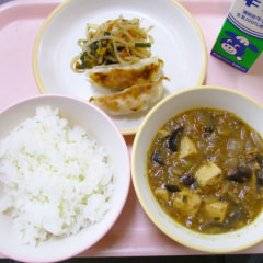 本日のメニューは、ごはん、マーボーなす、焼き餃子、もやしのポン酢炒めでした。