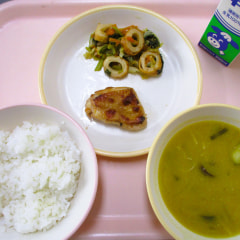 本日のメニューは、ごはん、夏野菜のみそ汁、鶏肉のマーマレード焼き、野菜とちくわの炒め物でした。