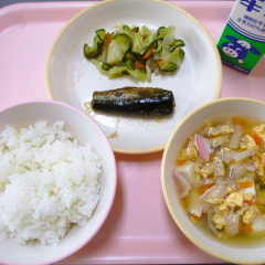 本日のメニューは、ごはん、かきたま汁、いわしの生姜煮、茎わかめ和えでした。