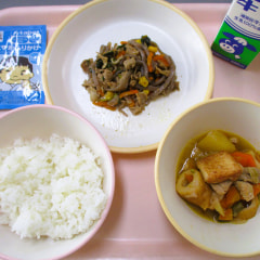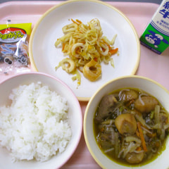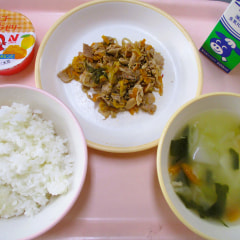 本日のメニューは、ごはん、わかめふりかけ、じゃがいものうま煮、こんにゃくの炒め物でした。