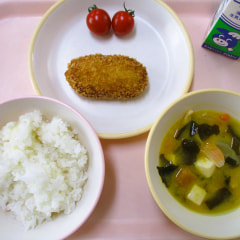 本日のメニューは、ごはん、かぼちゃの味噌汁、あじカツ、ミニトマトでした。