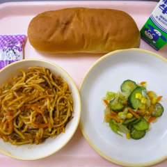 本日のメニューは、小パン、レーズンクリーム、なすとひき肉のスパゲティ、ぷちぷちサラダでした。