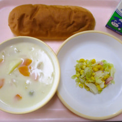 本日のメニューは、パン、クリームシチュー、コーンキャベツでした。