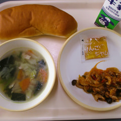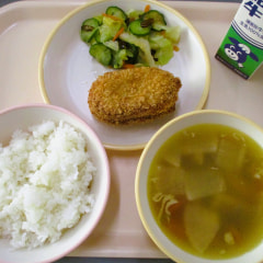 本日のメニューは、ごはん、けんちん汁、あじカツ、茎わかめ和えでした。