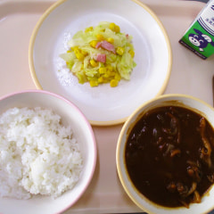本日のメニューは、ごはん、ハヤシライス、コーンキャベツ、ミルメークココアでした。