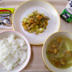 本日のメニューは、ごはん、石狩汁、豚肉のしょうが炒め、うまかってんでした。