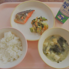 本日のメニューは、ごはん、みそ汁、鮭の塩焼き、煮びたしでした。