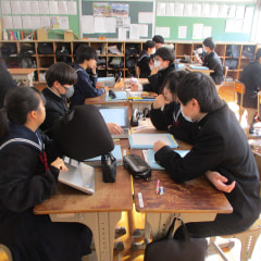 3年生の英語科の授業の様子です。これまでに習った表現を使って、新入生へのメッセージ動画を作成しました。4人組で、脚本家、…