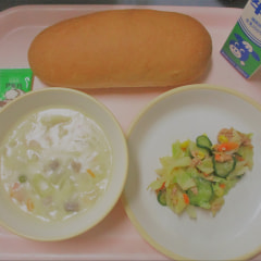 本日のメニューは、パン、マーガリン、クリームシチュー、ツナと野菜のサラダでした。