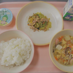 本日のメニューは、ごはん、かきたま汁、豚肉とはなっこりーの炒め物、小野茶ムースでした。